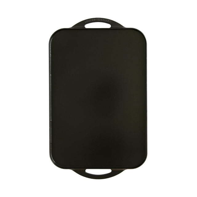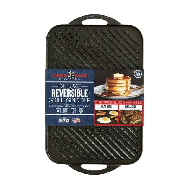 Made of heavy cast aluminumDistributes heat evenly for consistent baking resultsEasy-to-grasp handles on sides easy for moving to and from stove topPFOA-free nonstick coating for easy release and quick cleanupSpans 2 burners on most stove topsReversible with Grill and Griddle sides16.87 in. by 11.63 inHand Wash Recommended