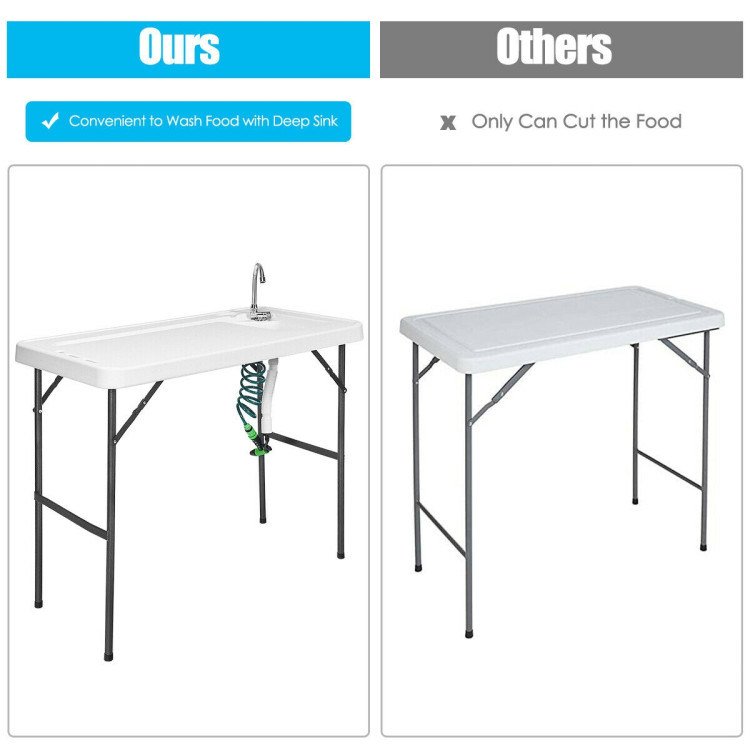 Quick-connect faucet and extending sprayer are perfect for cleaning fish and gameEasily connects to garden hose and has integrated sink with drain for added convenienceSloped surface and raised edges help maintain a clean working areaTable top is made of extremely safe sturdy plasticLeg is Powder coated finishedFolding legs allow for easy storage and portability