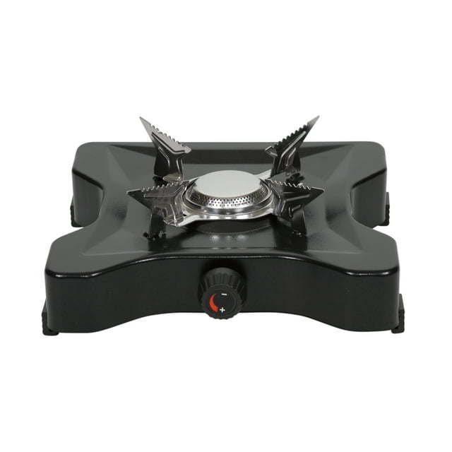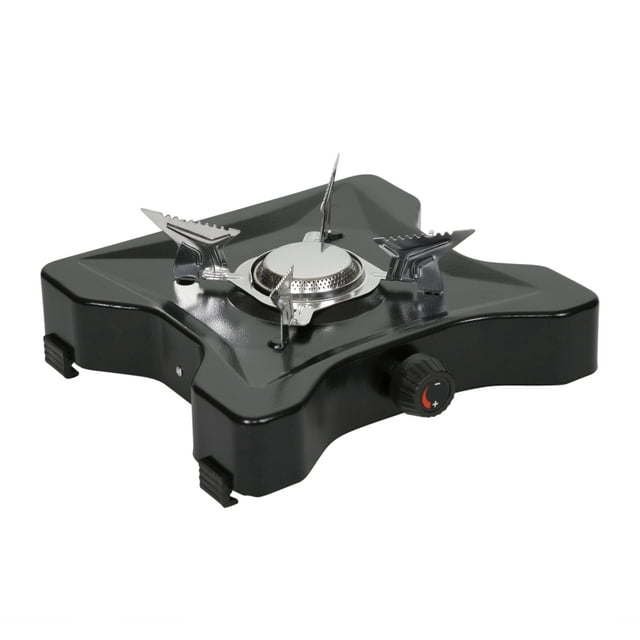 Product details Compact single burner propane stove with a durable and rugged design Ideal size for 1-2 people while camping, backpacking, and more! Cook fast with the single 8,200 BTU burner Durable heavy gauge steel construction with powder coated finish Detachable burner grate and brass regulator arm nest underneath for compact storage and travel Heavy gauge chrome steel burner grate also acts as a wind guard Recessed surface around burner for easy cleaningAssembled Product Weight